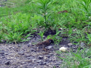 ↑途中で見かけた、自分と同じ大きさのパンと格闘する雀。